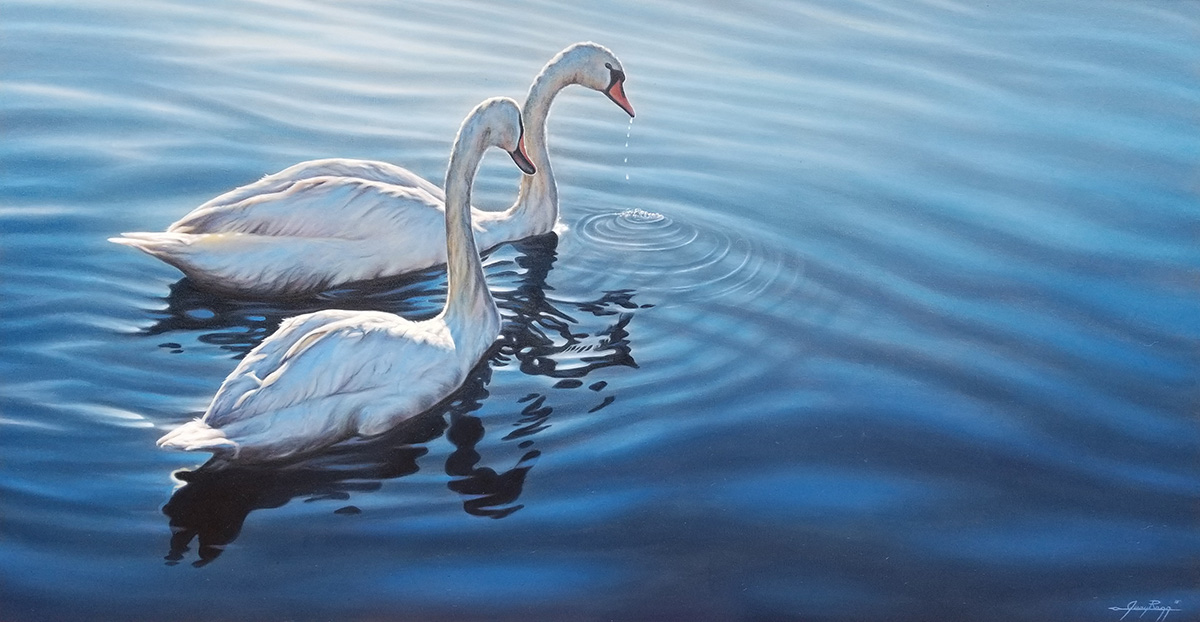 Two swans move gracefully across a back lit waterway in poetic gestures